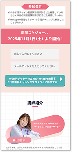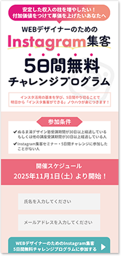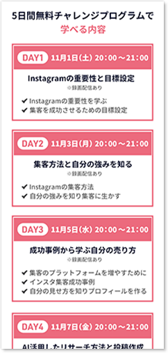 Instagramのカラフルなイメージを「Instagram集客」の文字に施しつつ、5日間で体験ができることを強調させたデザインです。